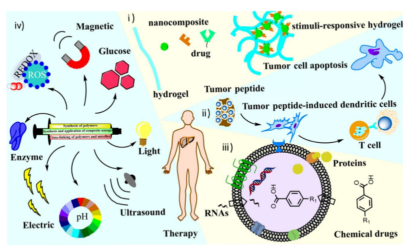 原发性肝癌是目前全球范围内的发病率最高的恶性肿瘤之一。全世界近一半的肝癌患者在中国。早期肝癌的诊断困难,大多数肝癌患者首诊就是晚期,错过了手术切除、肝移植等根治性治疗方法,预后相当差。目前的靶向和免疫等系统治疗为晚期肝癌患者带来曙光,但疗效有限,副作用大,耐药性高,限制了晚期肝癌患者长期生存率的提高。因此,如何开发出更多更有效的肝癌药物或肿瘤靶向的递送载体,受到许多科研人员的关注。水凝胶是一种含有大量亲水单体的柔软三维网络材料。通过在交联纳米复合水凝胶的网络结构中加入硝基苄基等基团,通过点击反应提高体内药物释放效率,从而提高肝癌患者的存活率,延长肝癌患者的存活时间。纳米复合水凝胶给药系统的应用不仅可以长期丰富肿瘤部位的药物浓度,还可以有效防止残留肿瘤细胞的远处转移。目前,已有大量研究应用于构建响应性纳米复合水凝胶药物递送系统,但很少有综合性文章对这些发现进行系统总结。本文总结了对外部或内部生理刺激起作用的纳米复合响应性水凝胶的合成方法和相关应用。在不同的物理或化学刺激下,药物的结构单元重排和控释可用于不同状态的响应性药物递送。