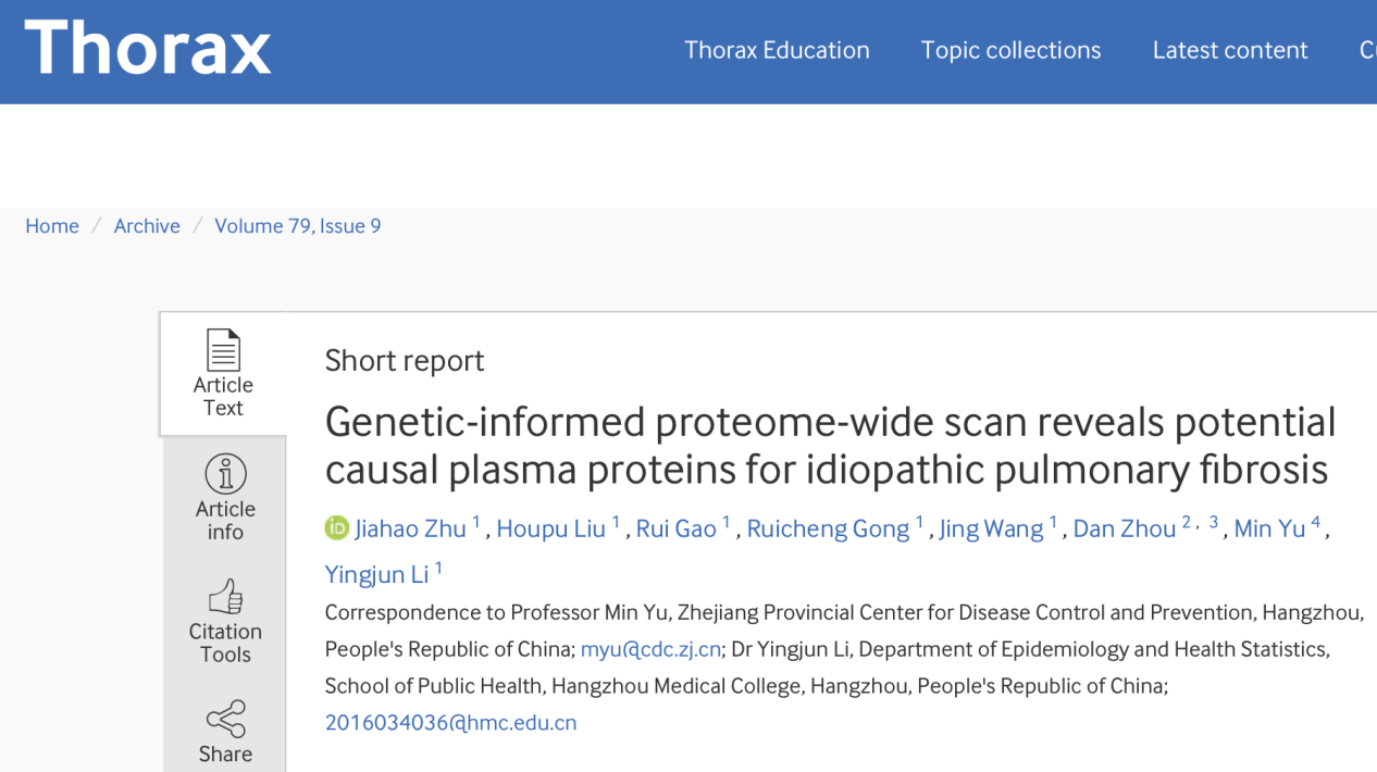 THORAX |公共卫生学院李迎君团队首次系统鉴定与特发性肺纤维化(IPF)存在因果关联的血浆蛋白