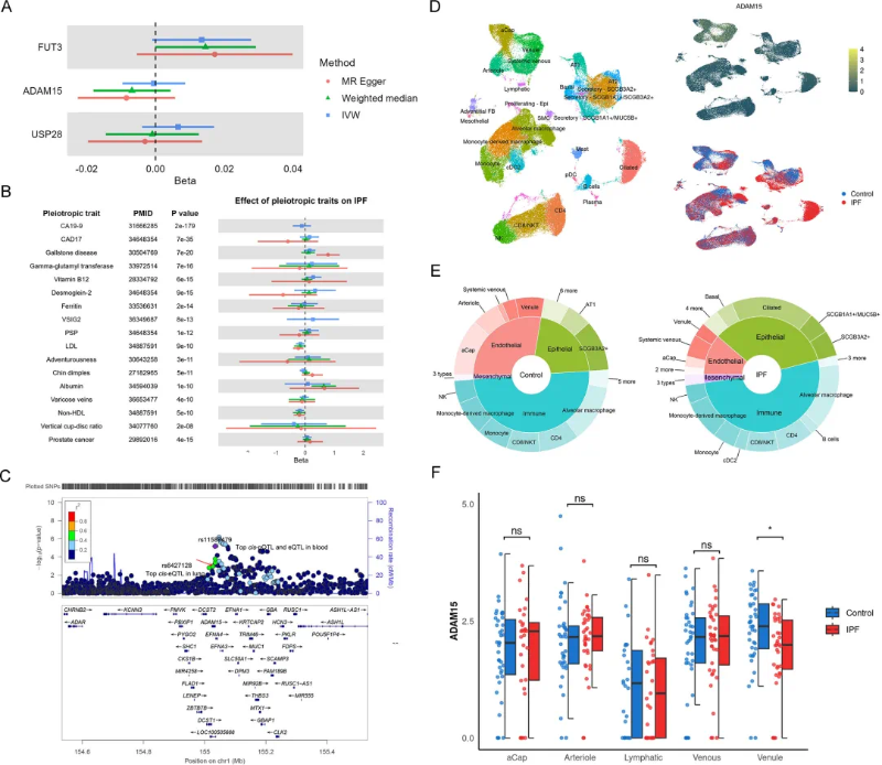 研究团队采用孟德尔随机化(MR)这一因果推断方法,整合了国际IPF遗传联盟(4,125例病例)和全球生物银行(6,257例病例)的遗传数据,以及冰岛和英国人群血浆蛋白质组数据(涵盖2,769种血浆蛋白)。通过严格的统计分析,研究发现ADAM15、FUT3和USP28三种血浆蛋白水平与IPF风险存在显著因果关联(FDR<0.05),其中ADAM15显示出最强的关联证据。研究团结进行多维度验证,共定位分析证实这三种蛋白与IPF共享相同的致病遗传位点,ADAM15的遗传变异在肺组织和血液中均显示出显著的表达调控效应,以及单细胞RNA测序显示ADAM15主要在肺内皮细胞中表达,且在IPF患者中表达降低。