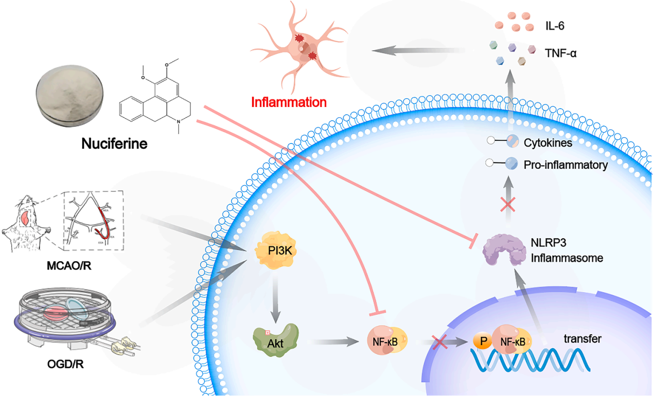 研究联用网络药理学、分子对接和实验验证方法。网络药理学分析表明,荷叶碱与脑缺血相关基因在炎症信号通路中存在显著富集。分子对接实验进一步证实其对NF-κB和NLRP3蛋白的作用。最终通过体外细胞实验(PC12细胞OGD/R模型)和体内动物实验(SD大鼠MCAO/R模型),验证了荷叶碱能够提高细胞存活率、减少凋亡、降低炎症因子表达,减少大鼠脑梗死面积,改善大鼠认知与运动功能障碍。上述作用涉及荷叶碱对PI3K/Akt/NF-κB通路的调节,荷叶碱可能成为治疗脑缺血再灌注损伤的潜在神经保护剂。
