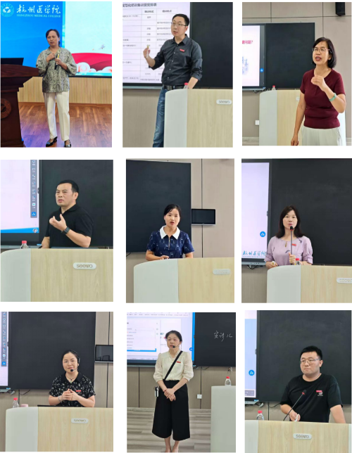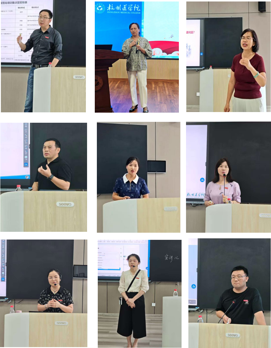 开班仪式后,集训营活动正式拉开帷幕。教师教学发展中心冀磊副主任、浙江省师德先进个人褚美芬教授,省最美教师周彩华教授、信息与教育技术中心辛均益主任、基础医学与法医学院刘丹丹教授、护理学院朱修文副教授、信息工程学院陶英副教授、康复学院徐琳峰副教授、创新创业学院栾一飞老师,分别从新教师规范化培训的任务与要求、师德师风、教学设计、人工智能赋能课堂教学、教案编写、课程思政、PPT课件制作、课程示范教学与研讨、创新创业等多个方面为大家带来精彩的讲座。
